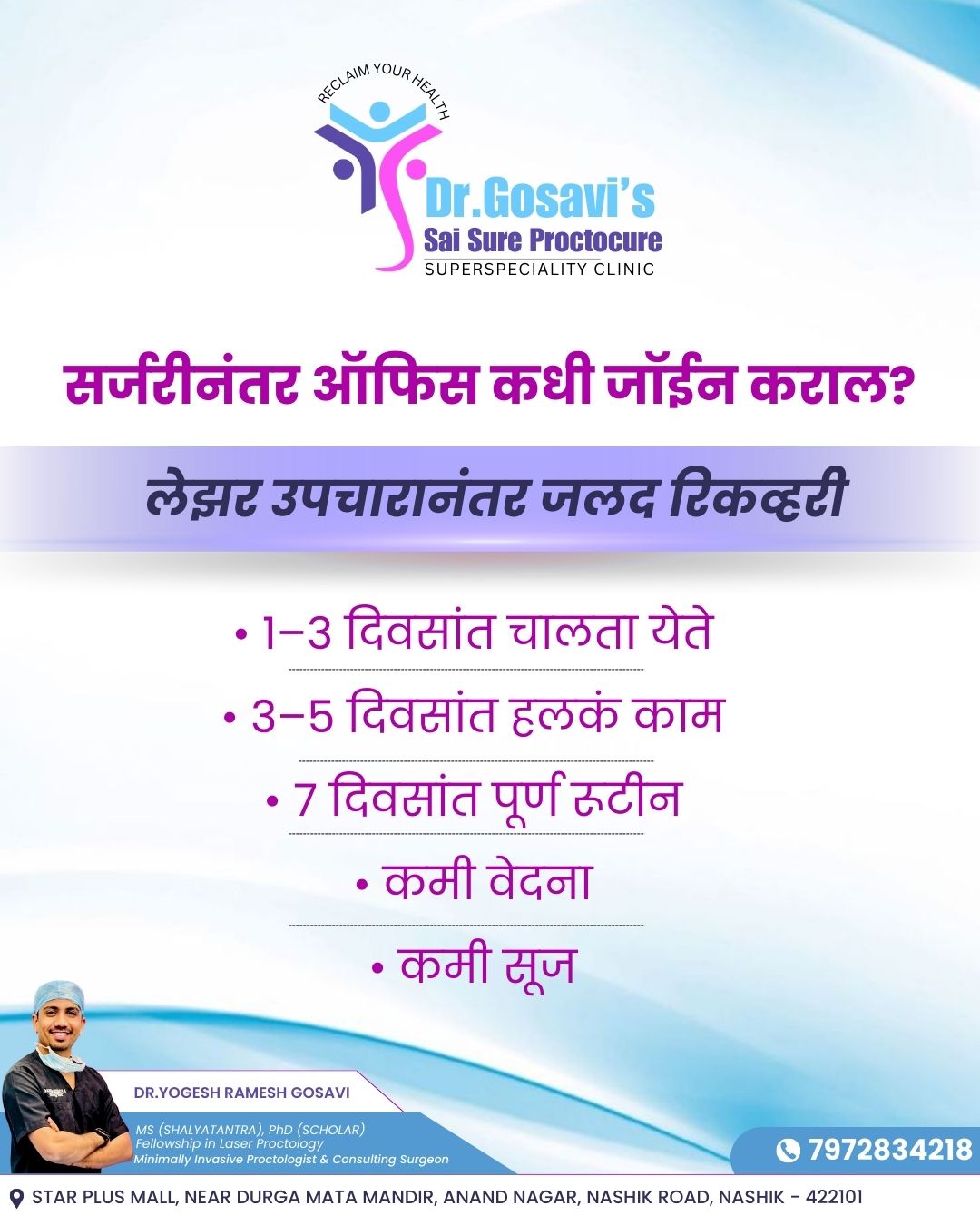 Dr Gosavi Saisureproctocure Clinic Star plus mall, near Durga Mata mandir, Anand Nagar, Nashik Road, Nashik, Maharashtra 422101 +918048127649 gosavidryogesh@gmail.com
